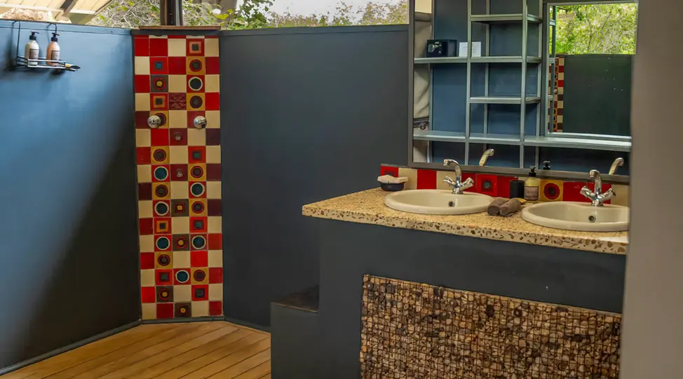 Kavinga features eight luxury safari rooms, each perched along the escarpment with sweeping views and a front-row seat to the dry riverbed below. The rooms are stylishly designed to balance rustic charm with modern comforts. The main area includes a lounge, bar, dining area, and an extraordinary hide at waterhole level, offering guests the chance to photograph and observe wildlife just meters away — sometimes close enough to get splashed by an elephant.