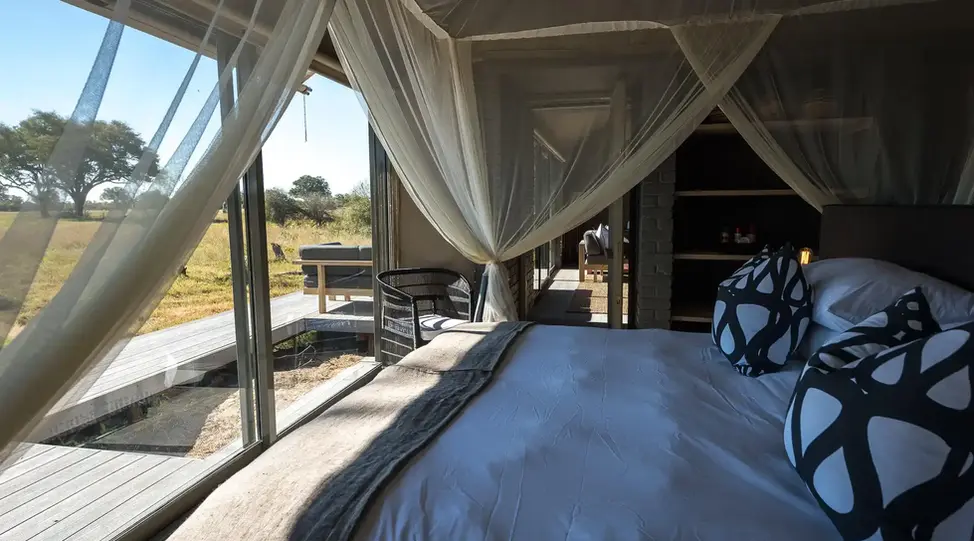 Linkwasha Camp features nine spacious tented suites, each offering open-plan interiors, canvas walls with panoramic views, and stylish Ndebele-inspired décor. Expect luxurious touches like private verandas, indoor and outdoor showers, and a family tent for multi-generational travel. The camp includes a sunken hide, swimming pool, star bed deck, and communal spaces infused with earthy textures and modern finishes — a low-impact, high-luxury safari experience.